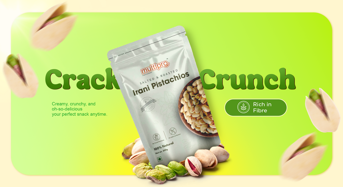 Savor the rich, naturally buttery taste of Multipro Salted & Roasted Irani Pistachios β€” a timeless snack crafted to perfection. Lightly salted and roasted in-shell for a crisp, satisfying crunch, these pistachios are packed with wholesome nutrients and unmatched flavor. Sourced from premium Iranian farms and hygienically packed in a no-touch facility, they’re the ultimate choice for health-conscious indulgence.